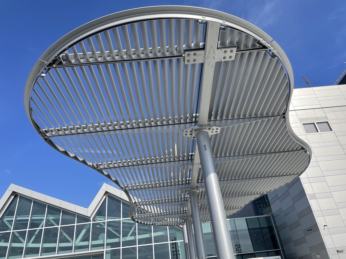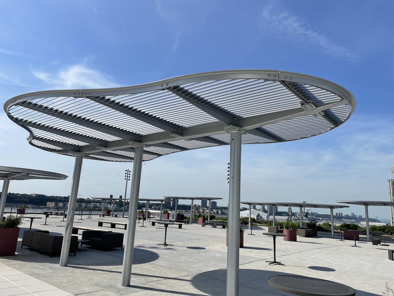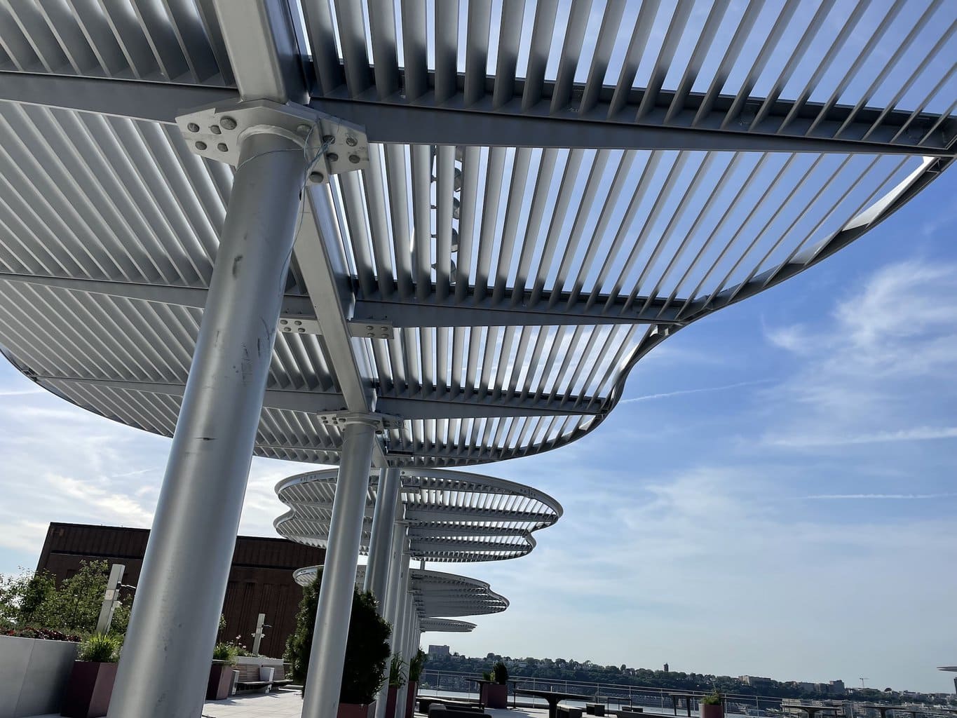 We worked directly with the architect during the design phase on this unique job. Initially we helped her explore concepts of stainless steel bar grating sunshades, suggested custom cut patterns of aluminum plates, and tossed around some different ideas. In the end the architect went with “blade” type of louvers of extruded aluminum. The challenge was making a high quality finished structural steel that would handle the wind and snow loads. We worked with our good partner Structures Workshop to develop the member sizes and connection details. We presented the concepts to the architect who made some tweaks. The final product still needed a few finishing touches so we visited the site and got input from the end users to create these sheet metal wrap around bits that go over the gaps in the perimeter angle frame.