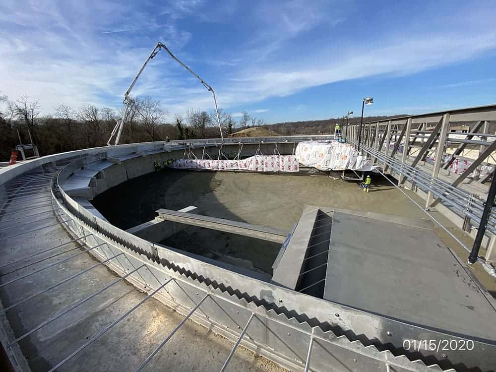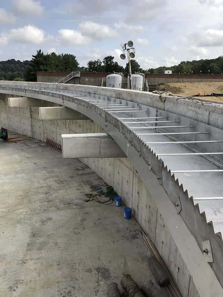Cody Builders Supply fabricated curved aluminum launders, baffles, and weirs for the Piscataway Secondary Clarifiers WSSC project. These wrap around five clarifier tanks to allow the clean water to be separated from the dirty water.